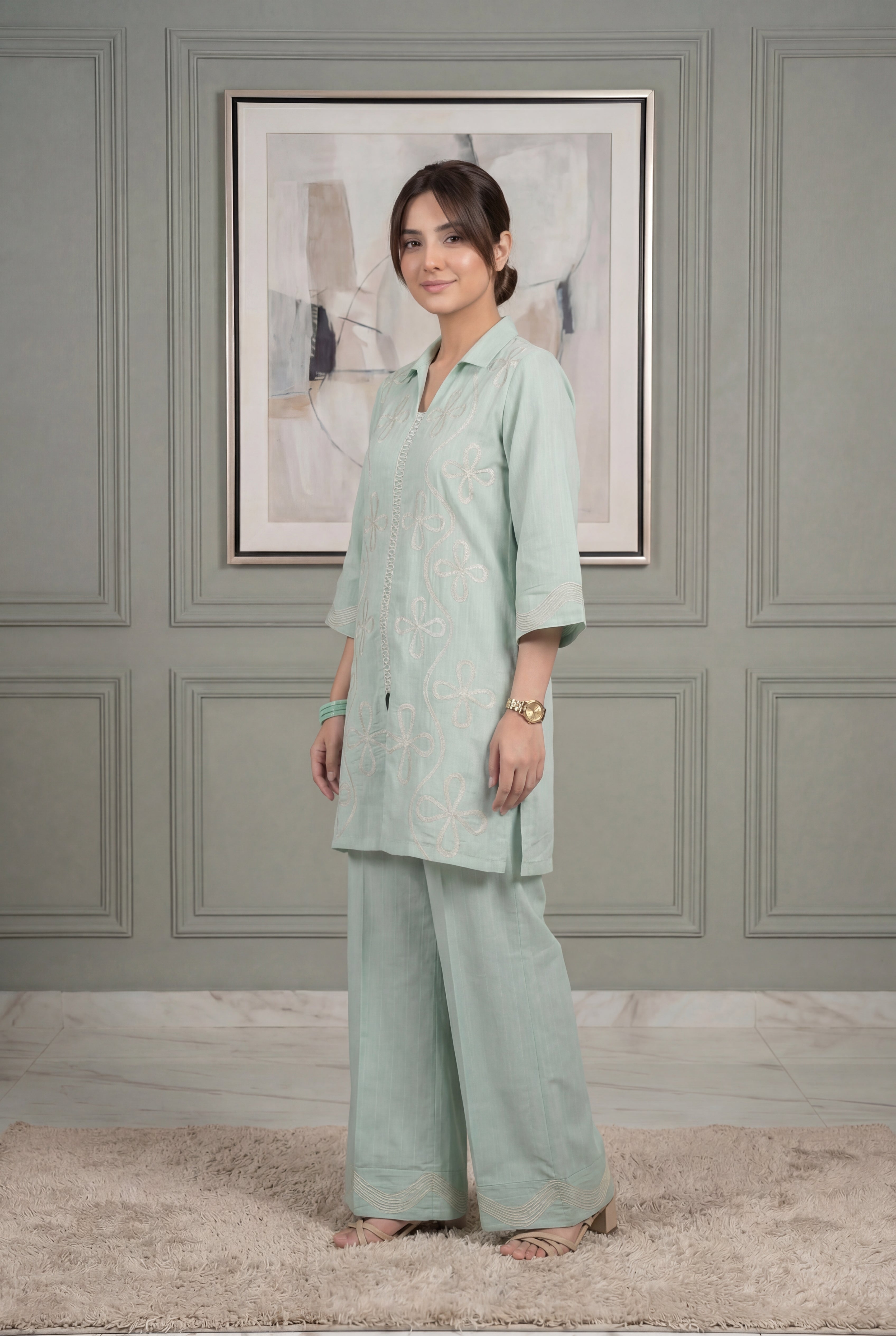 Trouser Style: Straight wide-leg trouser in matching fabric, designed for a comfortable and modern silhouette.