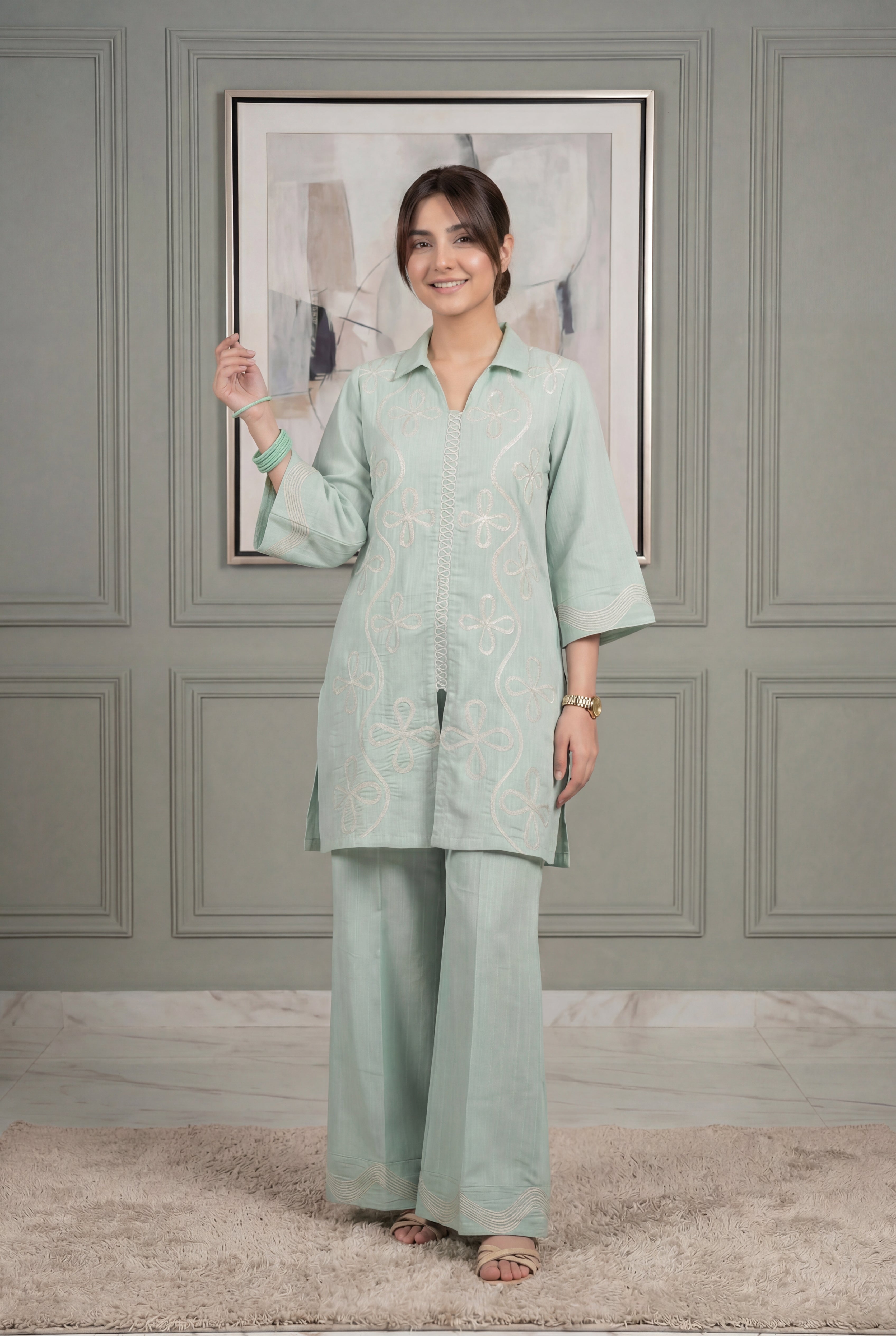 Shirt Style: Short-length A-line shirt featuring elegant floral embroidery on the front with a detailed embroidered neckline and loose bell sleeves for a graceful look.